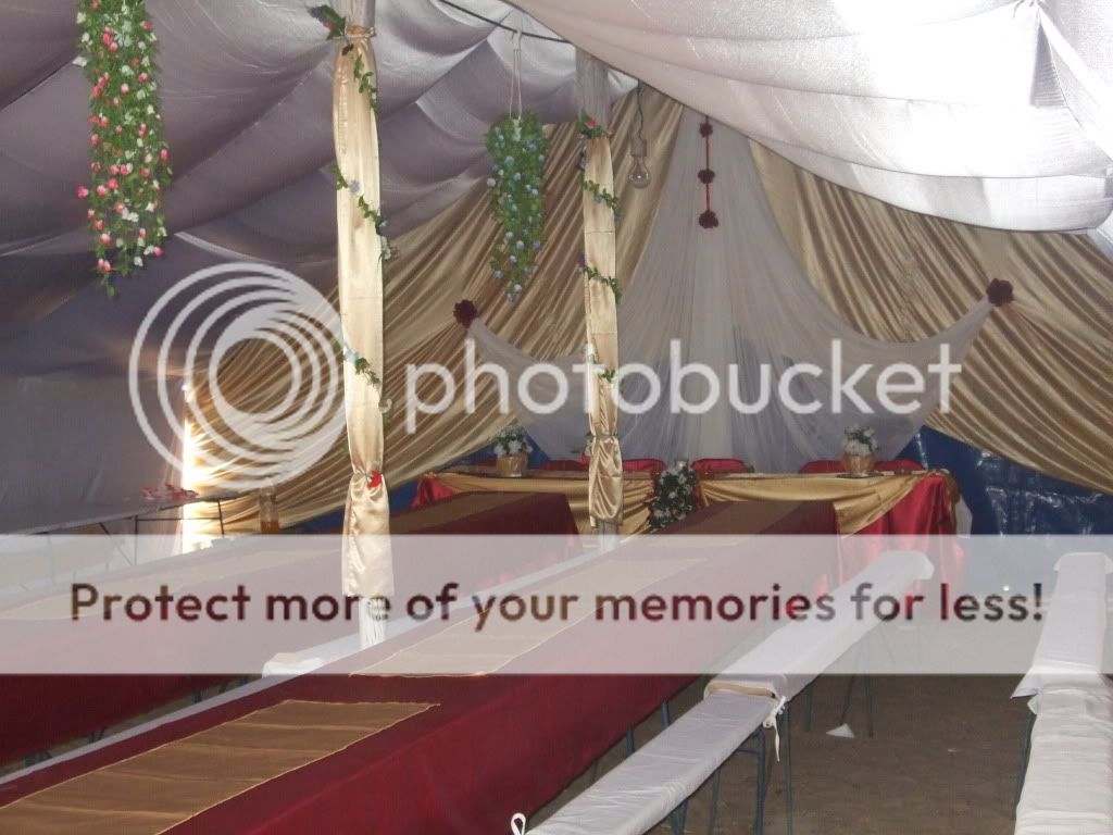 Pentru a recrea atmosfera eleganta ceruta de orice nunta, interiorul cortului va fi imbracat in totalitate, in valuri de saten si organza, in culorile alese de Dvs. Peretii si tavanul, spatele cortului (unde se afla masa mirilor si nasilor), stalpii de sustinere, sunt drapati cu eleganta, recreand atmosfera unei sali de bal.