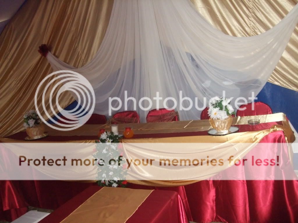 Nota: In toate pozele de mai sus, fundalul alb a fost utilizat doar pentru obtinerea contrastului. La aranjarea efectiva a cortului, spatele mesei mirilor va fi drapat ca in prima poza (reprezentand combinatia alb-portocaliu).